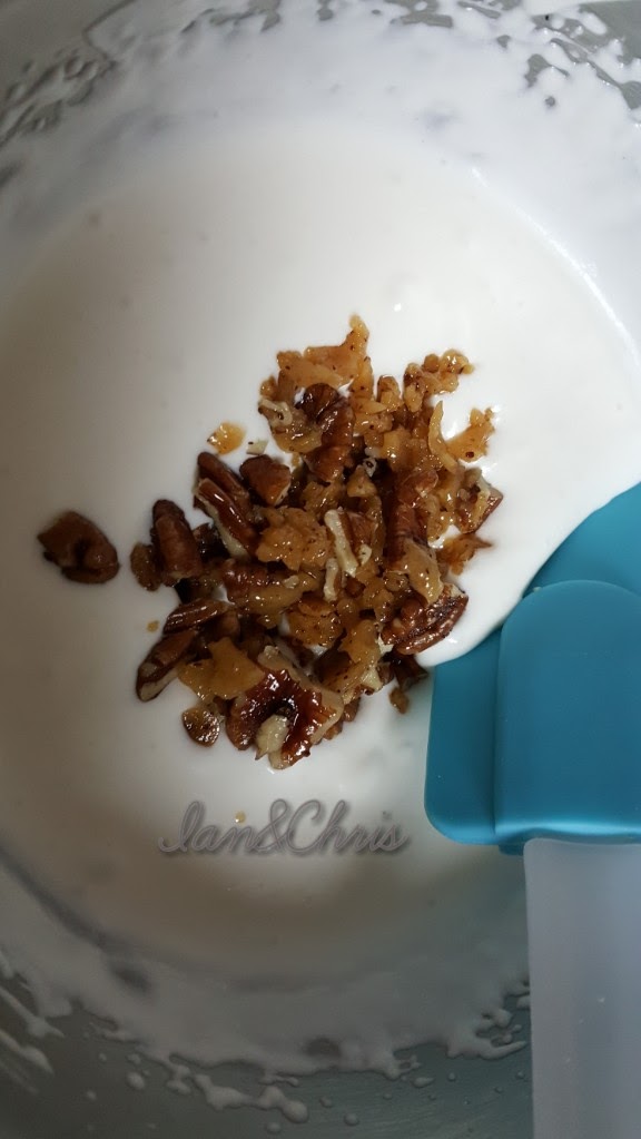 Mix crushed pecans sugar butter and cinnamon and heat in low flame in a pan till it caramelises but take care not to burn.