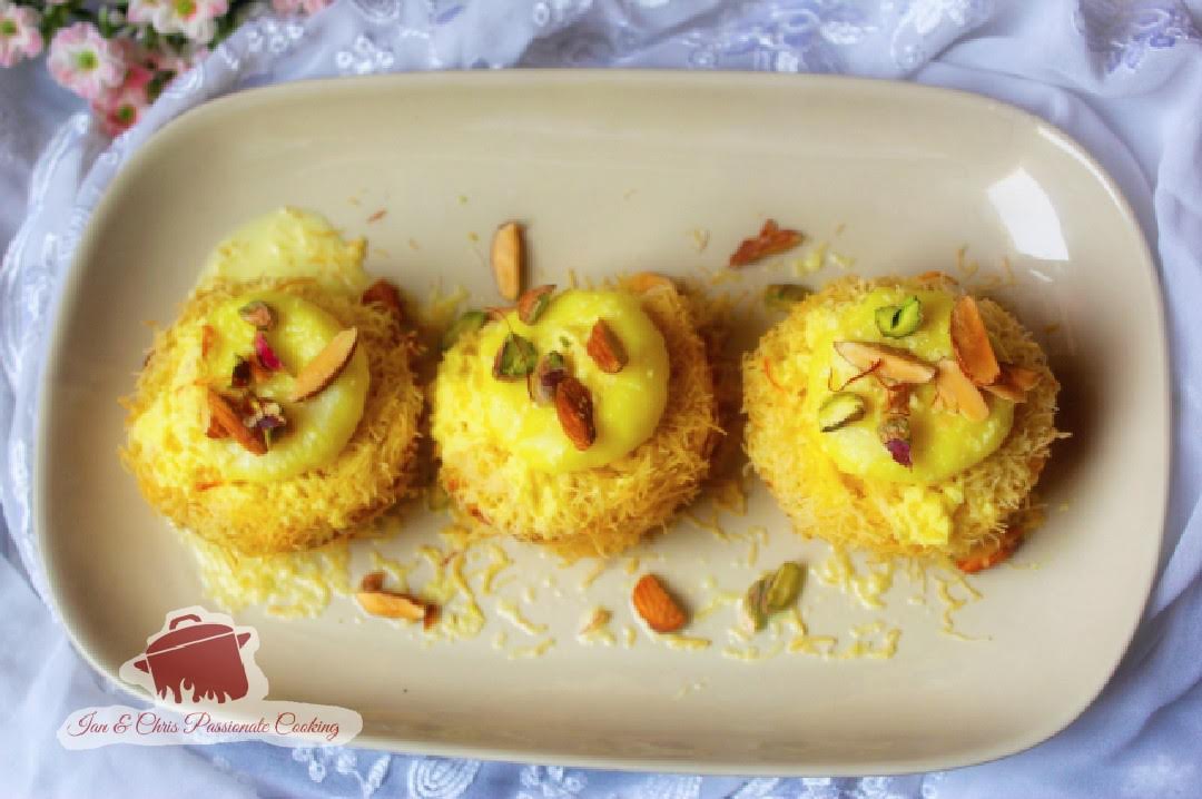 Take the kunafa dough and crush it when it is semi frozen and add melted.butter and mix well.Boil milk and heavy cream add sugar corn starch maida and saffron,keep stirring till it thickens ,add cardamom powder and switch off flame and let it cool.